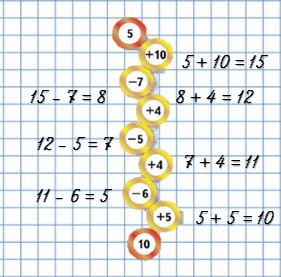 | 25 + 5 = 30 30 - 19 = 11 11 + 10 = 21 21 - 11 = 10 | 10 - 6 = 4 4 + 14 = 18 18 - 9 = 9 9 + 13 = 22 |