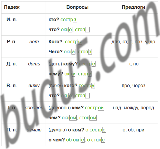 | Р. п. | нет | (нет) кого? сестры, чего? окна, стола | для, от, с, без, у, до |