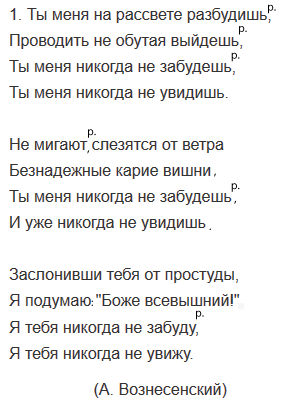 Помните ли вы наизусть слова современных песен, романсов? Знаете ли фамилии авторов слов? Проверьте себя и запишите по памяти 2-3 куплета из разных песен или из одной песни, укажите фамилию автора (авторов) слов. Если в тексте есть разделительные знаки препинания, то надпишите над ними букву р.