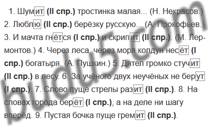 1. Шумит тростинка малая... (Н. Некрасов.) 2. Люблю берёзку русскую... (А. Прокофьев.) 3. И мачта гнётся и скрипит. (М. Лермонтов.) 4. Через леса, через моря колдун несёт богатыря. (А. Пушкин.) 5. Дятел громко стучит в лесу. 6. За учёного двух неучёных не берут. 7. Слово пуще стрелы разит. 8. На словах города берёт, а на деле ни шагу вперёд. 9. Пустая бочка пуще гремит.