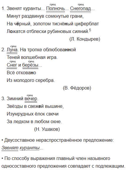 Спишите, найдите назывные односоставные предложения. Подчеркните в них главный член; укажите, чем он выражен. • Укажите двусоставное нераспространённое предложение. • С каким членом двусоставного предложения совпадает по способу выражения главный член назывного односоставного предложения?