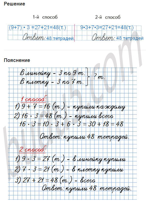 80. Мама купила для каждого из троих детей по 9 тетрадей в линейку и по 7 тетрадей в клетку. Сколько всего тетрадей купила мама?