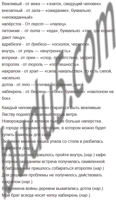 Вежливый, внезапный, напёрсток, питомник, вдребезги, внутрь, вопреки, второпях, нахрапом, дотла, набекрень.