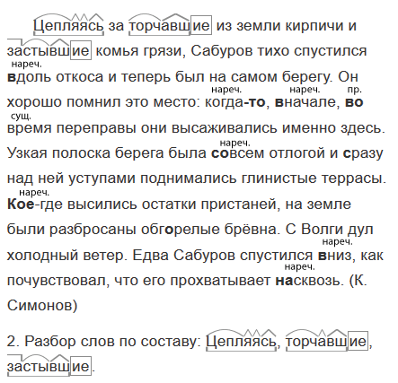 Цепляясь за торчавшие из земли кирпичи и застывшие комья грязи Сабуров тихо спустился (в) доль откоса и теперь был на самом берегу. Он хорошо помнил это место: когда (то), (в) начале, (во) время переправы они высаживались именно здесь. Узкая полоска берега была (со) всем отлогой и (с) разу над ней уступами поднимались глинистые террасы. (Кое) где высились остатки пристаней на земле были разбросаны обг..релые брёвна. С Волги дул холодный ветер. Едва Сабуров спустился (в) низ, как почувствовал, что его прохватывает (на) сквозь. (К. Симонов)