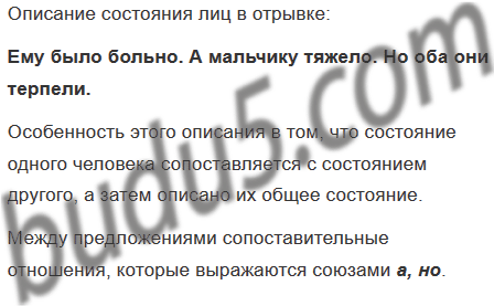 Когда они поднимались по лестнице, человек сильней опирался на плечо мальчика. Другой рукой он цепко хватался за перила, будто страшился, что ступенька уйдёт у него из-под ног. Ему было больно. А мальчику тяжело. Но оба терпели. Мальчик думал об осколке, который зашевелился в груди у незнакомца... А человек думал, как бы поскорее добраться до постели. (Ю. Яковлев)