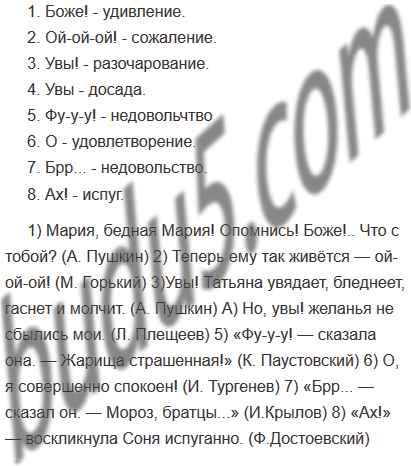 1) Мария, бедная Мария! Опомнись! Боже!.. Что с тобой? (А. Пушкин) 2) Теперь ему так живётся — ой-ой-ой! (М. Горький) 3)Увы! Татьяна увядает, бледнеет, гаснет и молчит. (А. Пушкин) А) Но, увы! желанья не сбылись мои. (Л. Плещеев) 5) «Фу-у-у! — сказала она. — Жарища страшенная!» (К. Паустовский) 6) 0, я совершенно спокоен! (И. Тургенев) 7) «Брр... — сказал он. — Мороз, братцы...» (И.Крылов) 8) «Ах!» — воскликнула Соня испуганно. (Ф.Достоевский)