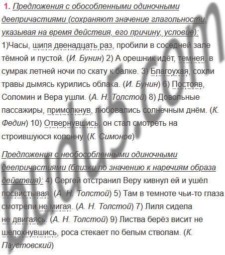 1)Часы шипя двенадцать раз пробили в соседней зале тёмной и пустой. (И. Бунин) 2) А орешник идёт темнея в сумрак летней ночи по скату к балке. 3) Благоухая сохли травы дымясь курились облака. (И. Бунин) 4) Сергей отстранил Веру кивнул ей и ушёл посвистывая. (А. Н. Толстой) 5) Там в темноте чьи-то глаза смотрели не мигая. (А. Н. Толстой) 6) Постояв Соломин и Вера ушли. (А. Н. Толстой) 7) Лиля сидела не двигаясь. (А. Н. Толстой) 8) Довольные пассажиры примолкнув любовались солнечным днём. (К. Федин) 9) Листва берёз висит не шелохнувшись роса стекает по белым стволам. (К. Паустовский) 10) Отвернувшись он стал смотреть на строившуюся колонну. (К. Симонов)