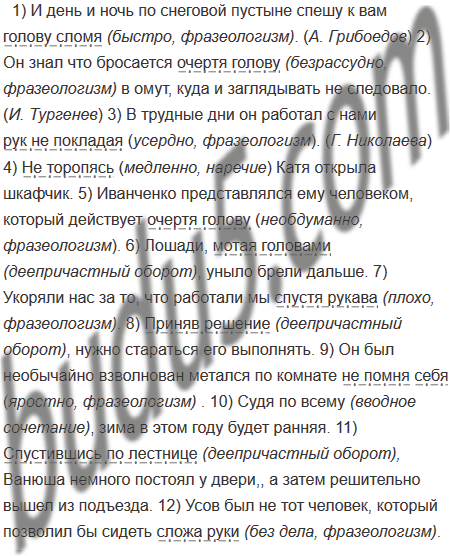 1) И день и ночь по снеговой пустыне спешу к вам голову сломя. (А. Грибоедов) 2) Он знал что бросается очертя голову в омут, куда и заглядывать не следовало. (И. Тургенев) 3) В трудные дни он работал с нами рук не покладая. (Г. Николаева) 4) Не торопясь Катя открыла шкафчик. 5) Иванченко представлялся ему человеком который действует очертя голову. 6) Лошади мотая головами уныло брели дальше. 7) Укоряли нас за то что работали мы спустя рукава. 8) Приняв решение нужно стараться его выполнять. 9) Он был необычайно взволнован метался по комнате не помня себя. 10) Судя по всему зима в этом году будет ранняя. 11) Спустившись по лестнице Ванюша немного постоял у двери а затем решительно вышел из подъезда. 12) Усов был не тот человек который позволил бы сидеть сложа руки.