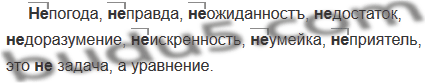 (Не)погода, (не)правда, (не)ожиданностъ, (недостаток, (не)доразумение, (не)искренность, (не)умейка, (не)приятель, это (не)задача, а уравнение.