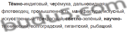 (Тёмно)индиговый, ч..рёмуха, дальн..видная, флот..водец, пр..мышленность, м..нуфактура, иску(с, сс)ный, иску(с, сс)твенный, пр..красный, (светло)зелёный, (научно)технический, волгоград..кий, гигант..кий, рыба..кий.