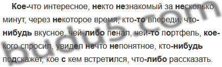 (Кое)что интересное, (не)кто (не)знакомый за (не)сколько минут, через (не)которое время, кто(то) впереди, что(нибудь) вкусное, чей(либо) п..нал, чей(то) п..ртфель, (кое)кого спросил, увид..л (не)что (не)понятное, кто(нибудь) по..скажет, кое(с)кем встрет..лся, что(либо) рассказать.