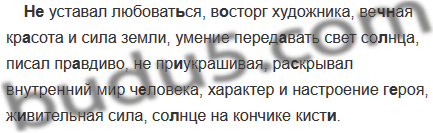 (Не)уставал любоват(?)ся, в..сторг художника, веч(?)ная кр..сота и сила земли, умение перед..вать свет со(?)нца, писал пр..вдиво, не пр..украшивая, раскрывал внутренний мир ч..ловека, характер и настроение г..роя, ж..вительная сила, со(?)нце на кончике кист.. .