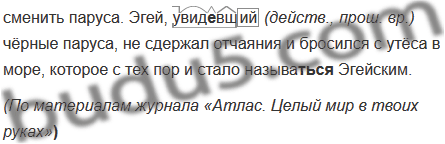 Эгейское море образовалось около 20 тысяч лет назад в результате погружения суши, частями которой и являются многочисленные острова на его поверхности. Практически с каждым островом и берегами Эгейского моря связан какой(либо) миф. Так, известен миф о Тесее, убивш..м Минотавра. В мифе объясняет(?)ся происхождение названия этого моря. Эгей, афинский царь, был отцом героя. Он условился со своим сыном, отправлявшемся на Крит, что в случае благополучного исхода (победы над чудовищ..м) чёрные паруса на корабле «смертников», приготовленных в качестве пищи для человекобыка, будут заменены на белые. Тесей победил Минотавра и благодаря Ариадне, давшей ему пут..водную нить, выбрался со своими спутниками из л..биринта, но между делом забыл сменить паруса. Эгей, увид..вший2 чёрные паруса, не сдержал отчаяния и бросился с утёса в море, которое с тех пор и стало называт(?)ся Эгейским.