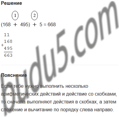 Задание № 5. Найди значение выражения (а + b) + с, если а = 168, b = 495, с = 5.
