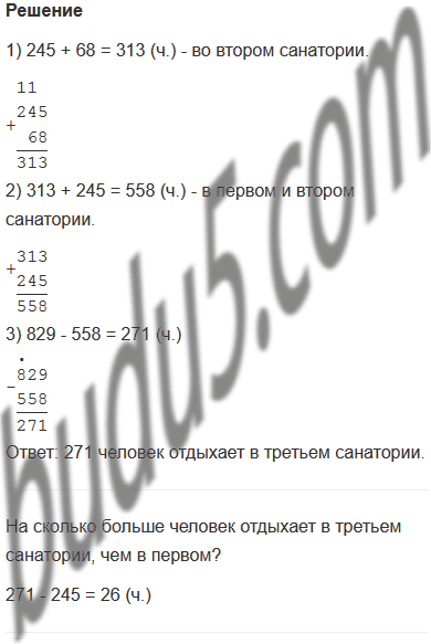 Задание № 6. В трёх санаториях отдыхает 829 человек. В первом санатории отдыхает 245 человек. Это на 68 человек меньше, чем во втором санатории. Сколько отдыхающих в третьем санатории? Поставь другие вопросы к этому условию и ответь на них.