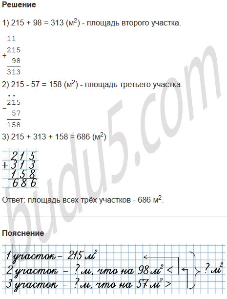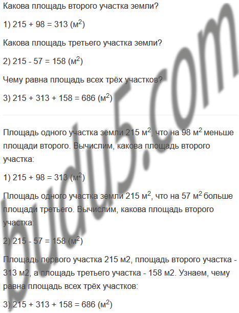 Задание № 8. Площадь одного участка земли 215 м2. Это на 98 м2 меньше площади второго участка и на 57 м2 больше площади третьего. Чему равна площадь всех трёх участков?