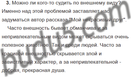 4. Прочитайте окончание рассказа «Мой некрасивый друг». Предвидели ли вы такой поворот событий? Какую проблему поднимает автор в своём рассказе? Ответьте на вопросы, с которыми автор обращается к читателям. Начните свой ответ со слов «Я думаю, что...», «На мой взгляд...» или «Мне кажется, что...». Такое начало настраивает на рассуждение, где вы будете высказывать своё личное мнение по поднятой автором морально-этической проблеме.