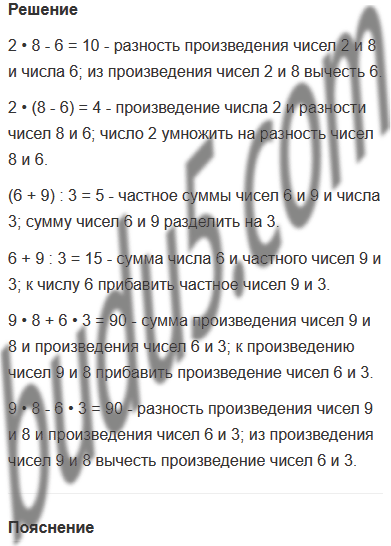| 2 • 8 - 6 | (6 + 9) : 3 | 9 • 8 + 6 • 3 |
