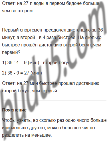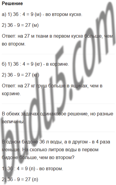 а) В первом куске 36 м ткани, а во втором - в 4 раза меньше. На сколько метров ткани в первом куске больше, чем во втором?