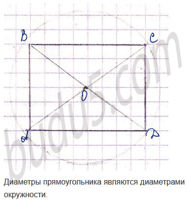 Задание № 15. Нарисуй прямоугольник со сторонами 4 см и 3 см. Проведи диагонали и обозначь точку их пересечения О. Построй окружность с центром в точке О, проходящую через одну из вершин прямоугольника. Что ты замечаешь?