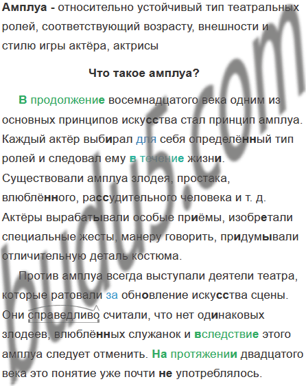 (В)продолжени.. XVIII века одним из основных принципов иску(с, сс)тва стал принцип амплуа. Каждый актёр выб..рал для себя определё(н, нн)ый тип ролей и следовал ему (в)течени.. жизн.. . Существовали амплуа злодея простака влюблё(н,нн)ого ра(с, сс)удительного человека и т. д. Актёры вырабат..вали особые пр..ёмы изобр..тали специальные жесты манеру говорить пр..дум..вали отличительную деталь костюма.4