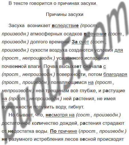 Засуха возникает (в)следстви.. отсутствия атмосферных осадков (в)течени.. долгого времени. (За)счёт сухости воздуха создаются условия для усиле(н,нн)ого испарения почве(н, нн)ой влаги. Почва высыха..т сначал.. с поверхности потом благодаря появляющ..мся на ней трещинам всё глубже и р..стущие на ней р..стения не имея возможности получить воду гибнут.
