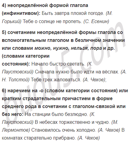 | 1) безличным глаголом, который вообще не может употребляться вместе с подлежащим: Ещё чуть брезжится. (А. Островский) 2) личным глаголом в безличном употреблении: 3) словами нет, не было (не оказалось, не вышло и др.) в отрицательных конструкциях: 4) неопределённой формой глагола (инфинитивом): Быть завтра плохой погоде. (М. Горький) Тебе о солнце не пропеть. (С. Есенин) | 1) сочетанием неопределённой формы глагола со вспомогательным глаголом в безличном значении или словами можно, нужно, нельзя, пора и др. (словами категории состояния): Начало быстро светать. (К. Паустовский) Сначала нужно было идти на вёслах. (А. Н. Толстой) Тебе грех жаловаться. (А. Чехов); 2) наречием на -о (словом категории состояния) или кратким страдательным причастием в форме среднего рода в сочетании с глаголом-связкой или без него: На станции было безлюдно. (К. Паустовский) В небесах торжественно и чудно. (М. Лермонтов) Становилось очень холодно. (А. Чехов) В комнатах старательно прибрано. (А. Чехов) |