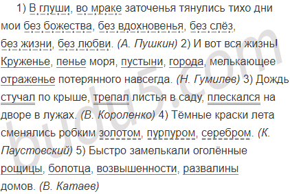 1) В глуши во мраке заточенья тянулись тихо дни мои без божества без вдохновенья без слёз без жизни без любви. (А. Пушкин) 2) И вот вся жизнь! Круженье пенье моря пустыни города мелькающее отраженье потерянного навсегда. (Н. Гумилев) 3) Дождь стучал по крыше трепал листья в саду плескался на дворе в лужах. (В. Короленко) 4) Тёмные краски лета сменялись робким золотом пурпуром серебром. (К. Паустовский) 5) Быстро замелькали оголённые рощицы болотца возвышенности развалины домов. (В. Катаев)