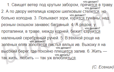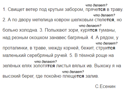 1. Свищет ветер под крутым забором, прячет(?)ся в траву. 2. А по двору метелица ковром шелковым стелет(?)ся, но больно холодна. 3. Полыхают зори, курят(?)ся туманы, над резным окошком занавес багряный. 4. А рядом, у проталинки, в траве, между корней, бежит, струит(?)ся маленький серебряный ручей. 5. В тёмной роще на зелёных елях золотят(?)ся листья вялых ив. Выхожу я на высокий берег, где покойно плещет(?)ся залив.