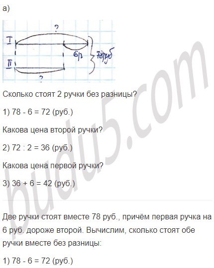 а) Две ручки стоят вместе 78 руб., причём первая ручка на 6 руб. дороже второй. Сколько рублей стоит каждая из этих ручек?
