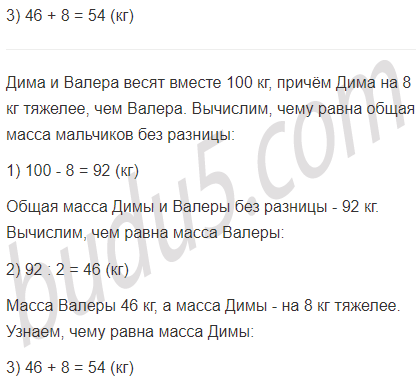 б) Дима и Валера весят вместе 100 кг, причём Дима на 8 кг тяжелее, чем Валера. Сколько килограммов весит каждый из ребят?