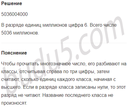 Задание № 6. Запиши число 5 млрд. 36 млн. 4 тыс. Какая цифра стоит в разряде единиц миллионов этого числа? Сколько в нём всего миллионов?