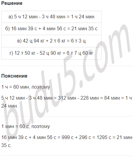 | а) 5 ч 12 мин - 3 ч 48 мин | в) 42 ц 94 кг + 2 т 6 кг |