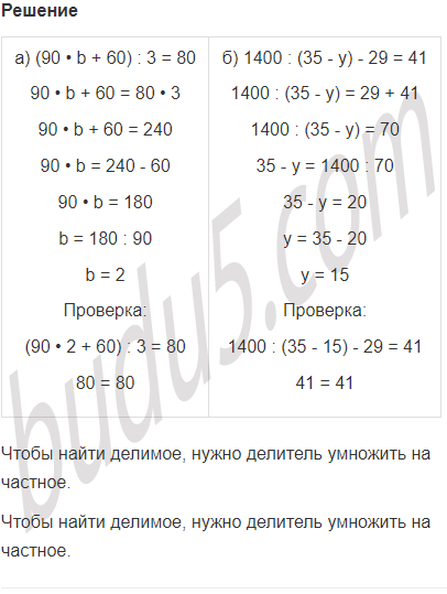 | а) (90 • b + 60) : 3 = 80 | б) 1400 : (35 - у) - 29 = 41 |