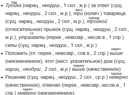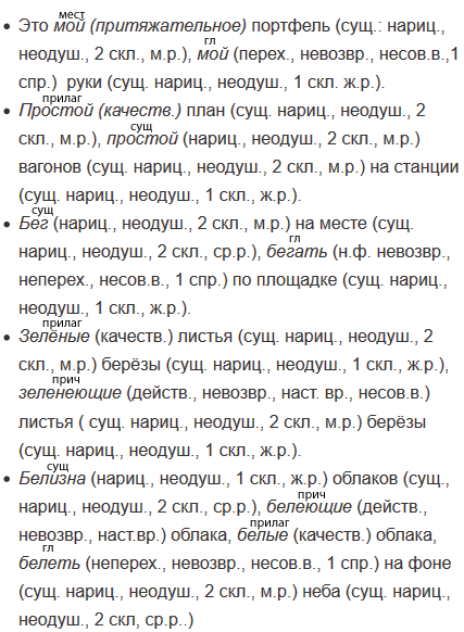 Это мой портфель, мой руки. Простой план, простой вагонов на станции. Бег на месте, бегать по площадке. Зелёные листья берёзы, зеленеющие листья берёзы. Белизна облаков, белеющие облака, белые облака, белеть на фоне неба. Тройка за ответ, три товарища, тройной прыжок, утраивать силы. Положить выше, этот дом выше. Решение неверно, отвечал неверно.