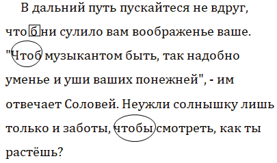 1. В дальний путь пускайтеся (не)вдруг, что(б) ни сулило вам вообр..женье ваше. 2. Что(б) музыкантом быть, так надобно уменье и уши ваших понежней3 им отвечает Соловей. 3. Неужли солнышку лишь только и заботы, что(бы) смотреть1, как ты р..стёшь?