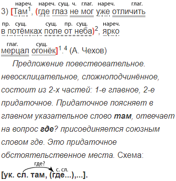 3) Там, где глаз не мог уже отличить в потёмках поле от неба, ярко мерцал огонёк. (А. Чехов) 4) Небо было там пурпурное тёплое и ласковое и манило туда, где оно касалось краем зелени лугов. (М. Горький) 5) Иди, куда влечёт тебя свободный ум. (А. Пушкин) 9) Когда мы подошли к правому берегу, мне указали там, где я меньше всего ожидал, узкую тропу вверх. 10) Красные лучи ложились огнистым свинцом по речке там, где она пряталась под нависшие кусты. (И. Тургенев) 11) Он выехал оттуда, откуда одна за другой съезжали во двор лошади. (А. Н. Толстой)